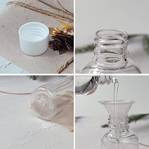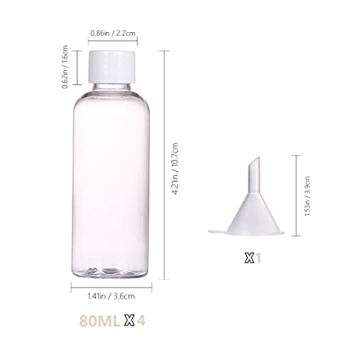 4 pcs Travel Bottles Set:One package includes 4 pack 80ml empty plastic bottles with screw lids,1 pcs funnels,1 pcs transparent bag.
